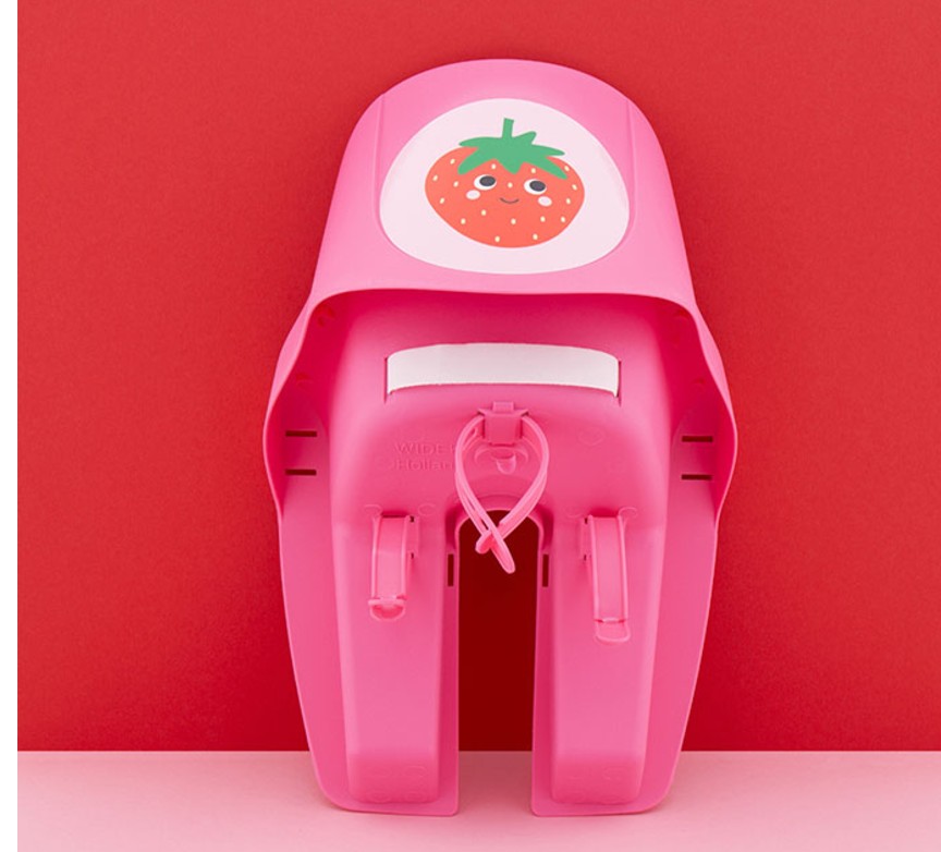 Söt rosa docksits med jordgubbsmotiv som ger dockan en trygg plats på barncykeln.