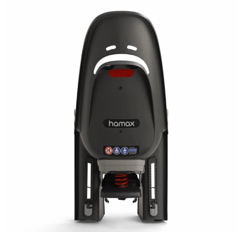 Robust Hamax Zenith cykelstol för pakethållare, växer med barnet, fjädring och justerbara fotstöd.