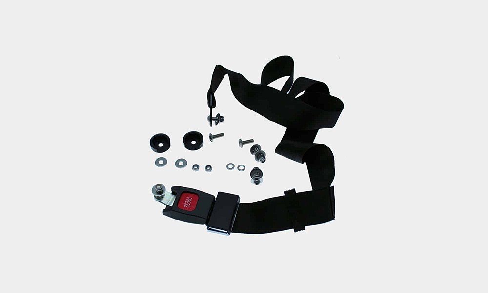 Bältet är tillverkat av slitstarkt material och utrustat med ett robust snabbspänne som gör det enkelt att spänna fast och lossa vid behov. Konstruktionen påminner om ett klassiskt säkerhetsbälte och är utformad för att ge stabilitet utan att begränsa rörelsefriheten i onödan.
