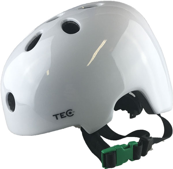 Tec Lex barnhjälm i vitt med grönt spänne, lätt och säker. Justerbar passform för barn med huvudomfång 48-52 cm.